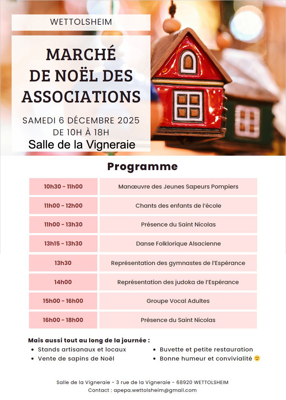 • Marché de Noël des associations : samedi 6 décembre 2025 - salle La Vigneraie, de 10h à 18h